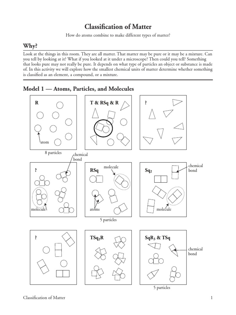 Particles can move about within a liquid, but they are packed densely enough that volume is gaseous matter is composed of particles packed so loosely that it has neither a defined shape nor a defined volume. Find a second rsq molecule and circle it. Matter is classified into two broad categories, namely, pure substances and mixtures. Matter is classified as a pure substance when all of the particles are identical. Matter is classified as a pure substance when all of the particles are. Liquid matter is made of more loosely packed particles. Matter is classified as a mixture if there are different types of particles present. Classification of matter based on composition when we talk about matter, usually we talk about a substance, which possesses distinct properties and has a definite composition. Q go back to the list above 1 18 and indicate whether intensive i or extensive. It will take the shape of its container. Locate the circled molecule of rsq in model 1. In this activity we will explore how the smallest chemical units of matter determine whether something is classified as an element, a compound, or a mixture. Identify which drawings from model 1 are pure substances and which are mixtures.